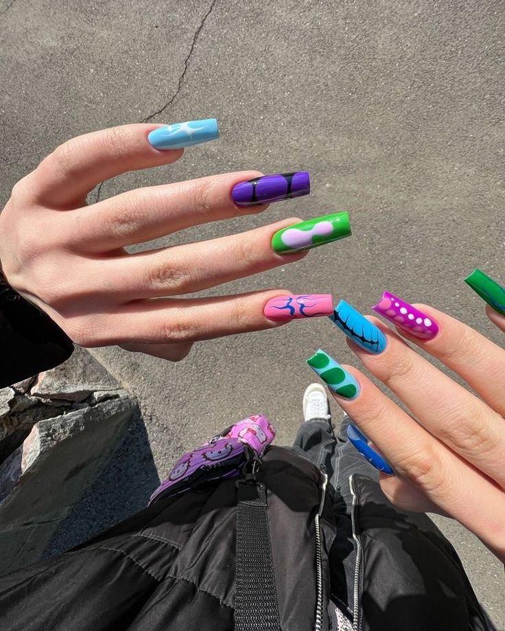 In this case, we have a playful design that is inspired by the abstract art theme. It uses bold color blocks and quirky patterns mainly in pink, green, purple, and blue. The opposite forms and surfaces give it a very strong artistic and fun feeling, therefore, it is perfect for people who love funky summer nails ideas. Besides, these nails are well matched with music festivals or summer events, as they can add a fun color to any outfit.
