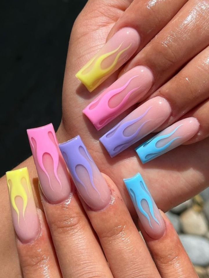 Chili hot yet candy-like, the pastel flame design is a beautiful combination of soft gradients and fiery edge tips. Pink, purple, blue, and yellow are the colors of these flames which can be considered a modernized version of the typical French tip. Set off at a summer beach, this fantastic design is a blend of brave and chic and feels like a must-try for 2025 fashion leaders.