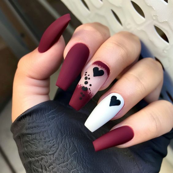 You’ll be amazed by the look. The combination of a matte burgundy finish with heart-shaped black and white accents is so eye-catching that it appears both dramatic and romantic. Adorned with these beautiful contrasts and textures, this art is ideal for a special event or a date. The coffin shape emphasizes the strength of the design, so it is an outstanding option for women who are fans of funky acrylic nails art patterns.