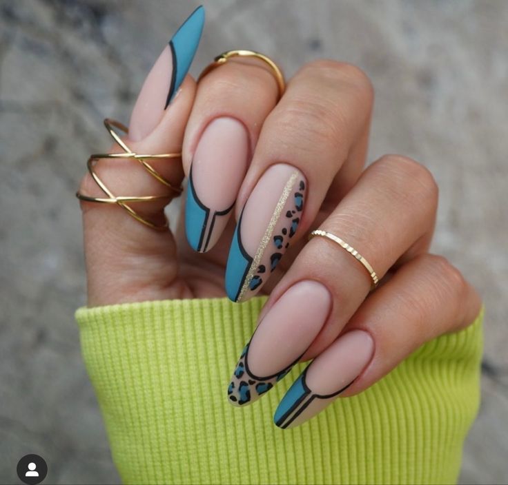 Elegance and playfulness in one piece is the main relief of this peculiar design of leopard prints, blue stripes, and nude bases. The use of gold accents in this outfit is a commendable idea as that is what makes it sophisticated overall, thus, it’s an appropriate choice for funky almond nails ideas. This nail design is for women who have a passion for the chic and bold styles that go from day to night effortlessly.