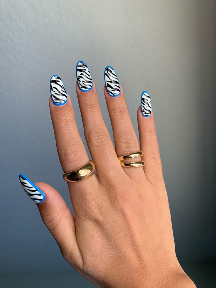 They are the motley scheme of black-and-white zebra stripes and blue-goal line color, which reminds us of animal skins. She will feel inspired and intricately feminine about these enthusiastic arrangements. These pieces of webbed nails are exactly what you need to wear at colorful parties or informal outings.