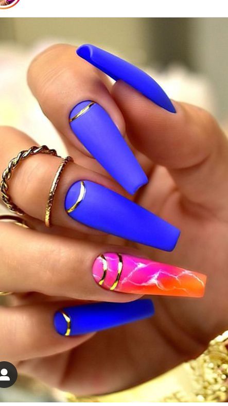 An energetic design with gold ink and neon pink marble patterns and not accent nails comprising blue design introduces a burst of energy and style. The use of both matte and glossy finishes creates a layered effect and therefore, this is a great idea for funky summer nails or bold evening wear. Gold jewelry is all you need to fully achieve a cohesive, statement look with the nails.