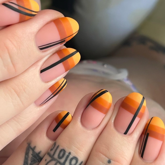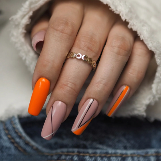 The lines of black and the color of orange have been used in the beautiful design that creates the object at issue. Geometric figures combined with lines give it an elegant and modern appearance. The way negative space is utilized gives a three-dimensional feel and makes the design more interesting. This type would be an excellent choice for anyone who wishes to have a refined and elegant manicure that is suitable day and night. The upper broader shape of the nails in this artistic design is a plus factor.