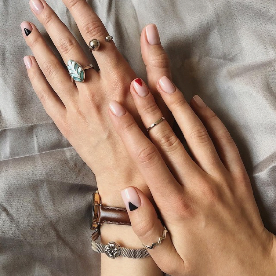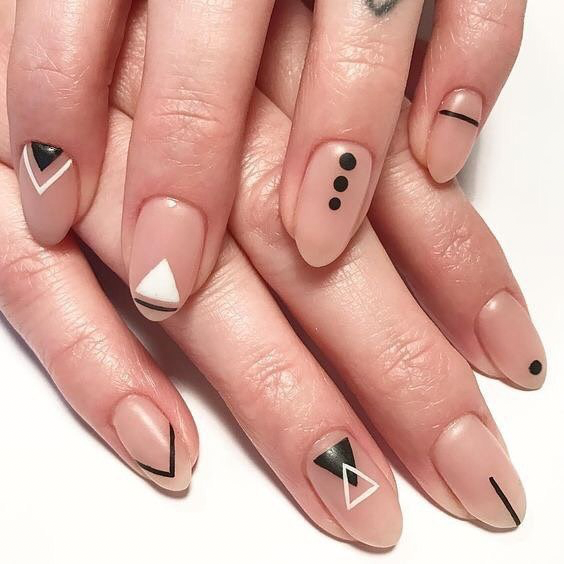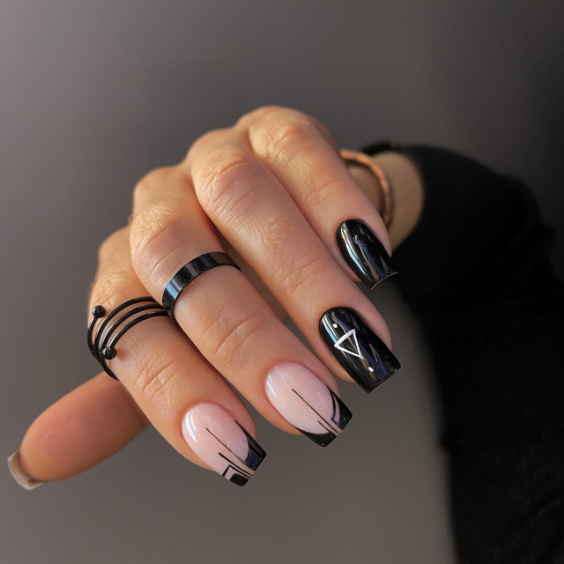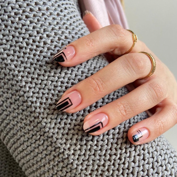 The design displays a nude base with black geometric accents, which together create an unforgettable contrast. The lines and shapes virtually give the impression of volume and superficiality to the nails, making them different to others. The way the design is kept minimalistic makes it stylish and tasteful, and thus it can also be worn at casual and formal events. The pattern is suitable even for short nails as it gives a contemporary and polished appearance.