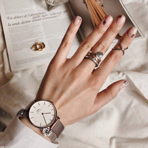 The third design is a perfect embodiment of understated elegance. Nails in nude color, along with very thin metal accents, create a look that is both exquisite and professional. This design is really simple yet it comes with a modern twist by using lines and dots that enhance its simplicity. It is a design that suits those who value minimalistic beauty and want a flexible manicure that can easily change from daytime to nighttime.
