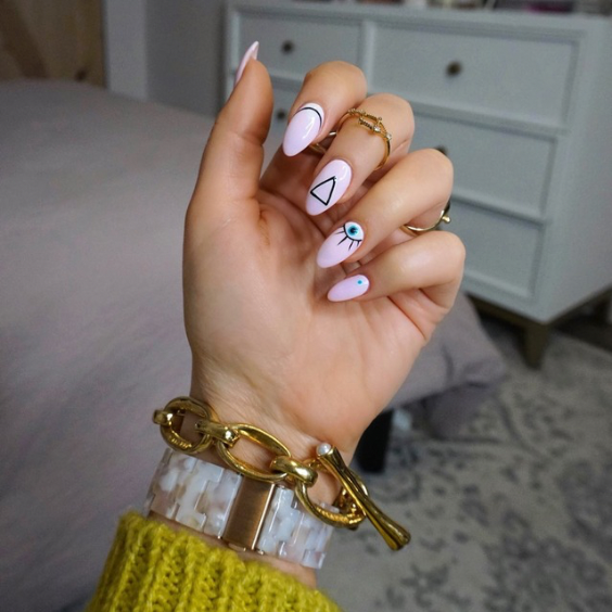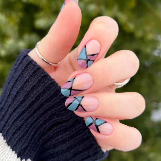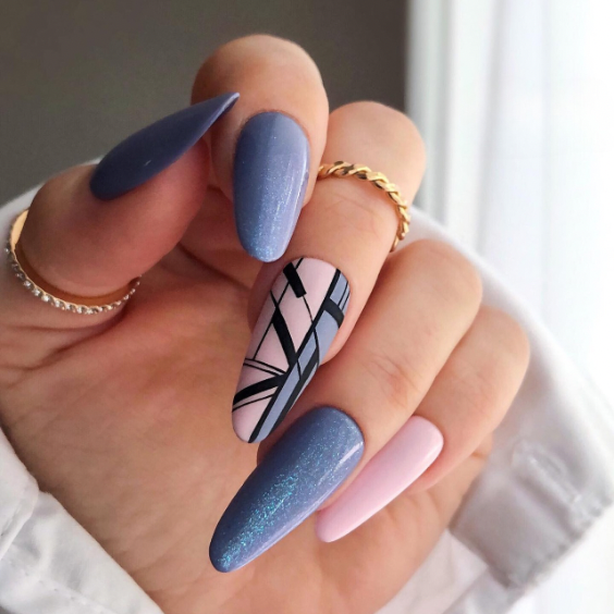 The design is a manifestation of the inkling of the blue and pink color scheme as well as the black geometric forms. The design with the lines and the shapes accompanies a recently made and a fashion forward look. The combo of the colors is that it brings a fun touch to the design so that it can be worn for both informal and formal occasions. This artistry indeed is fabulous when applied on almond-shaped nails, giving a trendy and elegant touch.