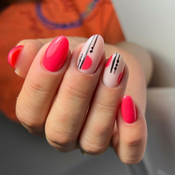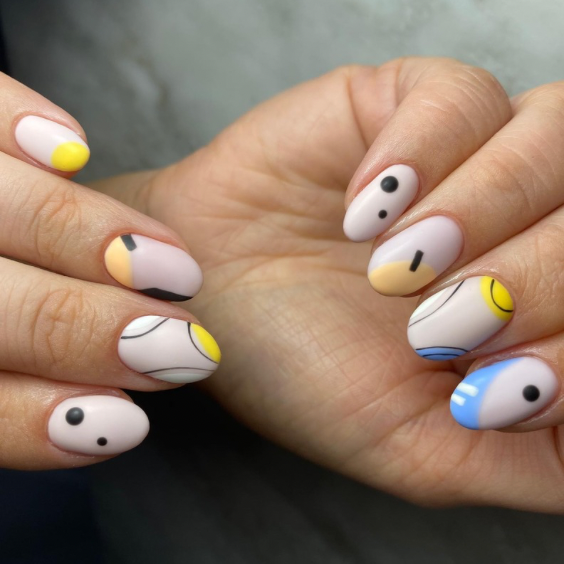 The unimaginable design incorporates a mixture of pallete colors and primitives of various geometric shapes. The color combos of pink, yellow, and green are use of light and cheerful colors. Dots and lines add a little jauntiness to the design, XD//making it suitable for summer. This type is good with almond-shaped nails, which will present a lively and young style.