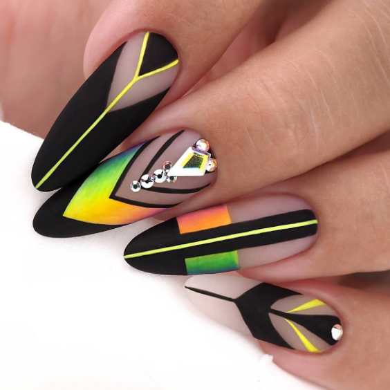 The amazing design that stands out has black thick lines with luminescent neon zz colors. The pattern of triangles and various geometric figures creates a modern and rough look. The complementary of rhinestones with this design gives it a glamorous look which makes it suitable for special events as well as for a night out. This style is a good fit for the women who like to draw all the attention to their nails with the help of them.