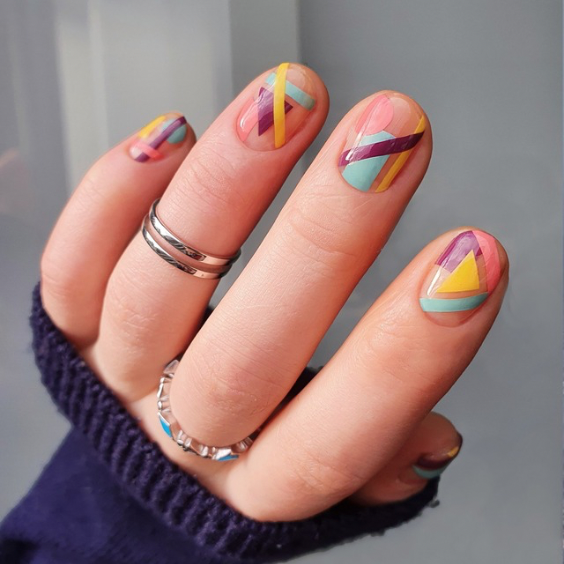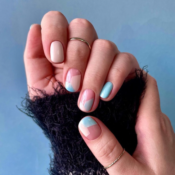 The sophisticated design that this one is displays a pastel color blocking technique with pink and blue being the primary colors. The arrangement of lines and geometric figures form a peaceful and soothing effect, which is just right for those who like the understated style. The specific color combination of this design means that it can be worn at both formal and casual occasions, thus, it will add elegance to even the simplest outfit. It is such a trendy yet practical way to wear this style on a short nail, which looks very tidy and professional.