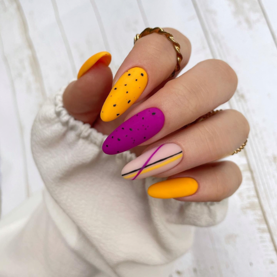 A yellow and purple colored scheme with a high degree of vivacity and playful black dots is the highlight of this design. The color combos and geometric shapes make this design stand out, adding a touch of fun and creativity to your nails. The arrangement of lines and dots depicts an eye-catching pattern that is great for summer. In almond-shaped nails, this style not only fits but also gives a feeling of a cheerful and energetic appearance.