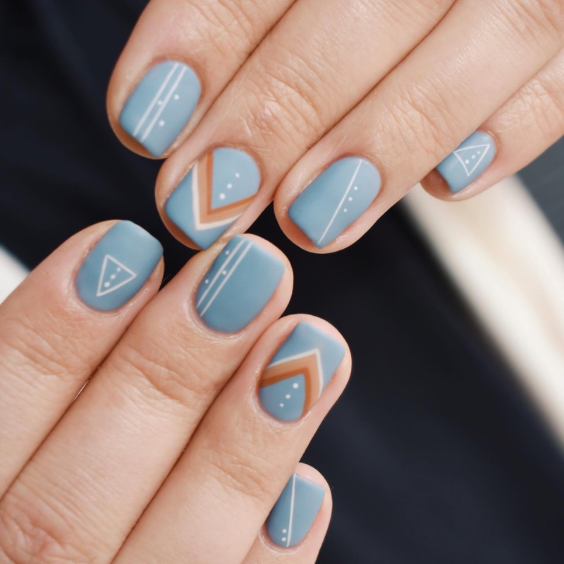 The cool blue design built on white and brown with the help of geometric shapes is stunning. The triangles and lines give a neat and contemporary atmosphere, suitable even for the ones who adore utter minimalism. The use of dots brings a hint of playfulness to the design that is appropriate for both casual and formal events. This pattern is also appropriate for short nails, giving a tidy, professional effect.