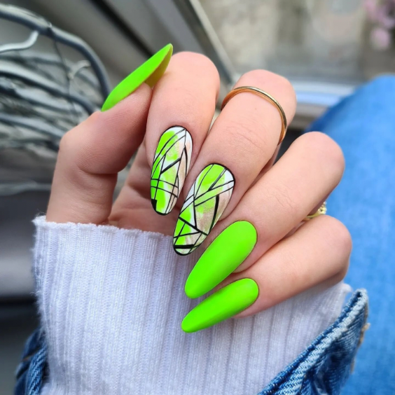 The design is characterized by the use of neon green nails along with large black geometric shapes. The extraordinary color pairing and detailed diagrams make this creation just right for the ones who want to catch the eye. The use of an empty space makes the design have depth and volume, therefore, it’s good to be remembered. The style is perfect for almond nails, which gives a fashionable and sharp look.