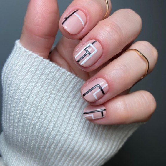 is a trendy art that combines stark contrast between white and nude with intricate black geometric lines. Among the shapes, the lines bestow the design an aura of simplicity and elegance. The negative space component in the artwork is responsible for the extra depth, and it contributes to the aesthetics of the minimalist beauty it is aptly made for. This design is suitable for square-shaped nails, where the style is simple and looks professional.