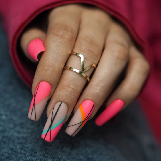 Neon pink and orange together with bold black geometric accents are the colors of this design. The lines and shapes together bring a sense of liveliness to the design. The negative space which is used here is a great contrast and brings a 3D aspect to the design, which is great for the people who want a very strong statement. The design on the square nail shapes that promotes the edgy, and cool look is the one that is most appropriate for this kind of style.