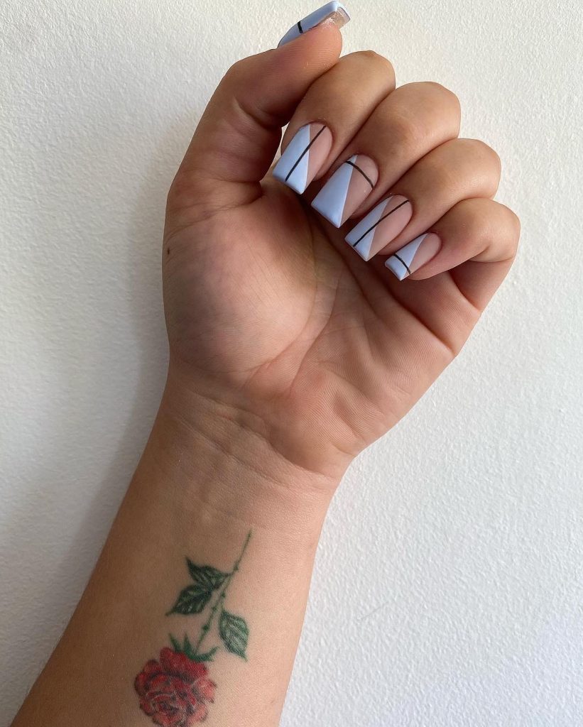 This design is a mixture of black and nude which gives it a modern and clean look. The lines and geometric shapes make a lovely design that can easily attract people’s eyes. The use of empty spaces as a design element not only makes it more refined but also offers it to those who are looking for a stylish and cutting-edge manicure. On square nails, it is particularly cool because it seems to be so built-in and avant-garde.