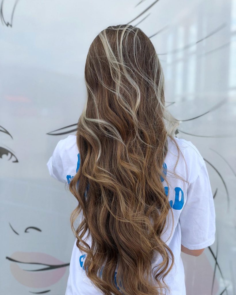 This look captures a more natural feel, perfect for brunettes who want to add dimension without a complete color overhaul. The soft brown base is accented with thin, platinum highlights that frame the face and cascade down in loose waves. This style suits women with long, flowing hair, as the platinum strands catch the light and enhance the hair’s movement. The result is a look that’s both cool and sophisticated, fitting perfectly with the aesthetic of effortless beauty. Ideal for those looking to maintain a low-maintenance style that still makes a statement.