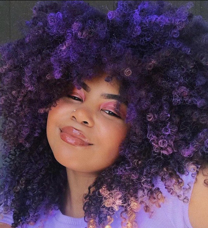 For those who love a softer, yet still vibrant approach, this lavender and purple afro brings a pop of color to natural curls. The shades of purple vary slightly throughout, creating depth and dimension that give it an almost ethereal feel. This look is ideal for black hair and curly textures, lending itself to a cool aesthetic that exudes creativity. Pair it with minimal makeup to let the hair color shine or complement it with matching eye makeup for a cohesive, fun look. The color choices here align well with fashion-forward individuals who aren’t afraid to stand out.