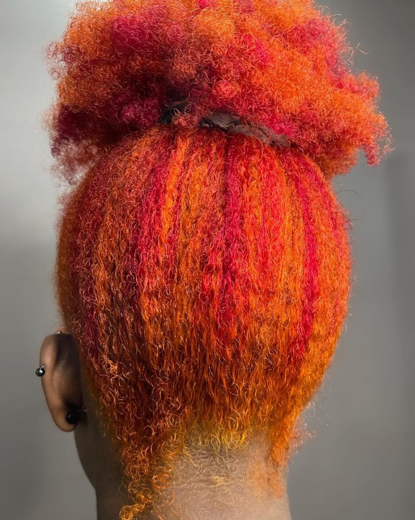 This bold and eye-catching color combines bright magenta roots with fiery orange streaks towards the ends, creating a vibrant gradient that captures attention. The color’s intensity is perfect for those with curly hair or loose waves, where each hue can stand out with every movement. The look works well for individuals looking to embrace cool and unique colors that reflect an adventurous spirit. Ideal for brunettes and for black women, this color scheme is ideal for anyone ready to turn heads with a bold, expressive look.