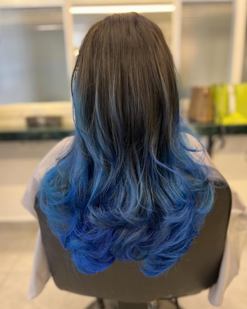 This gorgeous ocean-inspired blue ombre starts with dark, nearly black roots, flowing into a deep cobalt and brightening towards the tips. The seamless blend of hues resembles ocean depths, creating a unique, cool aesthetic for those who love statement colors. It’s a fantastic choice for brunettes looking to add bold color without completely bleaching their hair. This style suits those with long, wavy hair as the color adds dimension, highlighting each wave. This dye job is ideal for anyone ready to make a splash with a trendy, fun look in 2025.