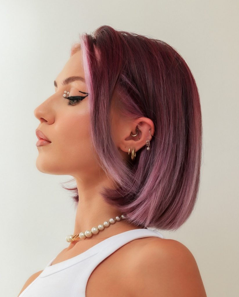 This chic purple bob combines shades of muted lavender and dusty rose, creating a sophisticated yet playful look. The layered tones add depth, giving it a unique appeal that’s perfect for those seeking a modern and stylish color. This look is especially flattering on short hair and complements cool undertones beautifully. The subtle blend of purples suits both for brunettes and lighter hair bases, offering a natural pastel finish that’s trendy without being overpowering. It’s an ideal style for someone looking for a fun but elegant change.