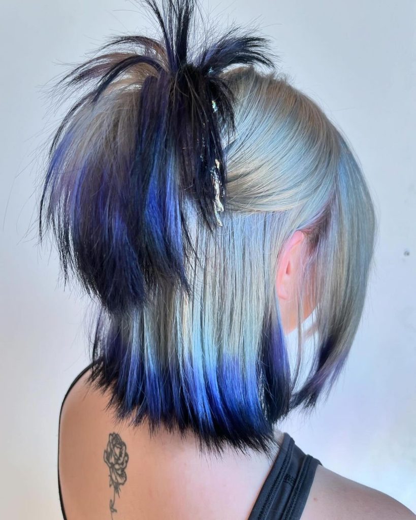 This edgy hairstyle features a pastel blue base with pops of deep black at the tips and roots, giving it a punk-inspired, grunge aesthetic. The layers are cut to give a feathered, choppy look that enhances the dual-toned color scheme. This style suits both short and medium-length hair, and is perfect for those seeking a cool, avant-garde look. The blend of soft pastel and bold black provides a fresh take on traditional highlights, ideal for those wanting a bold yet sophisticated style for 2025.