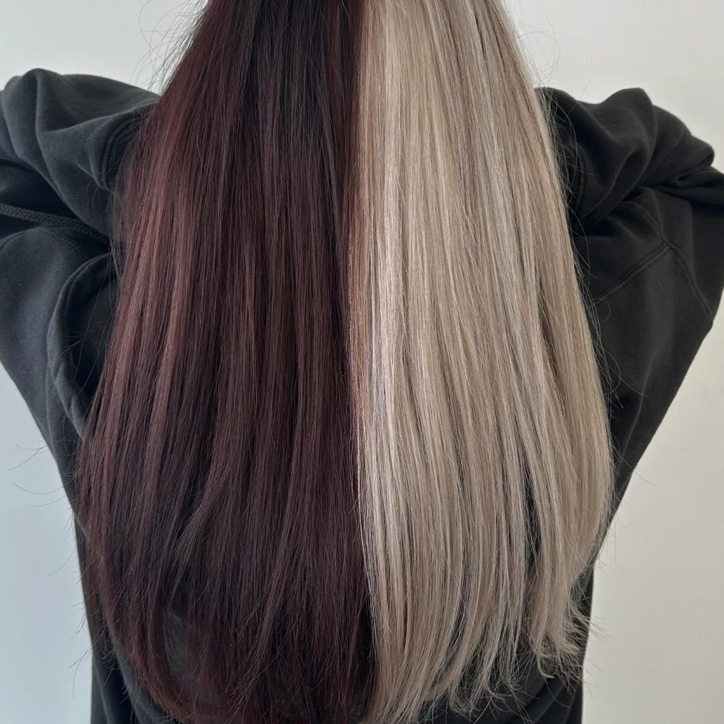 This polished black-and-platinum two-tone style is a sleek take on the classic split-dye trend. With jet black on one side and platinum blonde on the other, this look is grunge with a modern twist. The clean middle part enhances the stark contrast between the two colors, making it perfect for those who want a bold statement. This style is particularly flattering for brunettes looking to add an edge to their look while maintaining a chic, refined feel. It’s an ideal choice for both short hair and longer locks, with the colors bringing a high-fashion appeal to everyday wear.