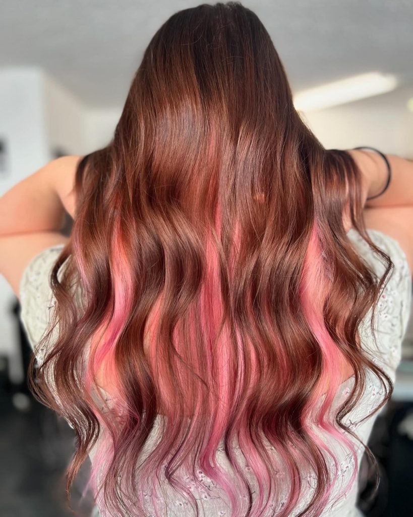 This beautiful brown and pink peekaboo hairstyle combines natural brunette waves with soft pink highlights hidden underneath. This subtle yet playful color choice is ideal for brunettes who want to experiment with color while keeping it understated. The pink tones add a fun and romantic touch, perfect for spring and summer. This look suits longer hair, where the colors blend beautifully with loose waves, creating a chic and modern look that’s easy to maintain.