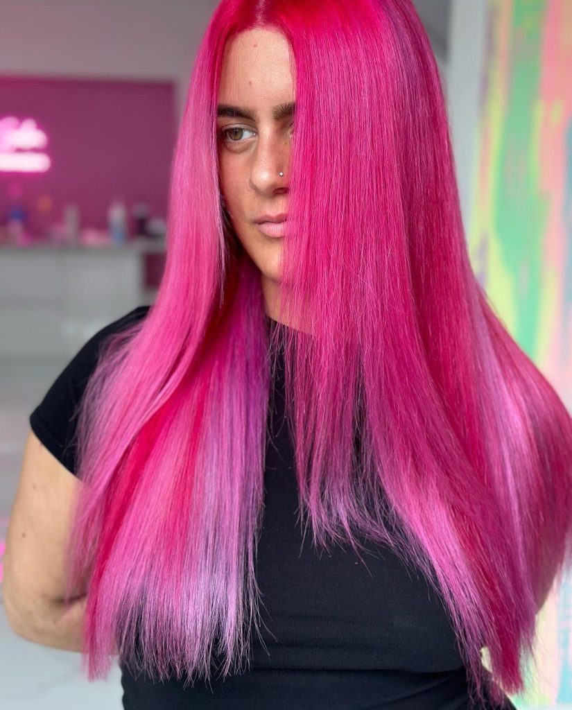 For those who want to make a powerful statement, this neon pink look is the ultimate choice. With vibrant pink covering the entire length of the hair, this color is both bold and beautiful. Perfect for brunettes who want a full transformation, the bright shade creates a high-impact look that’s sure to turn heads. The straight, sleek finish accentuates the intensity of the color, making it a go-to for anyone who loves a fun and cool vibe.