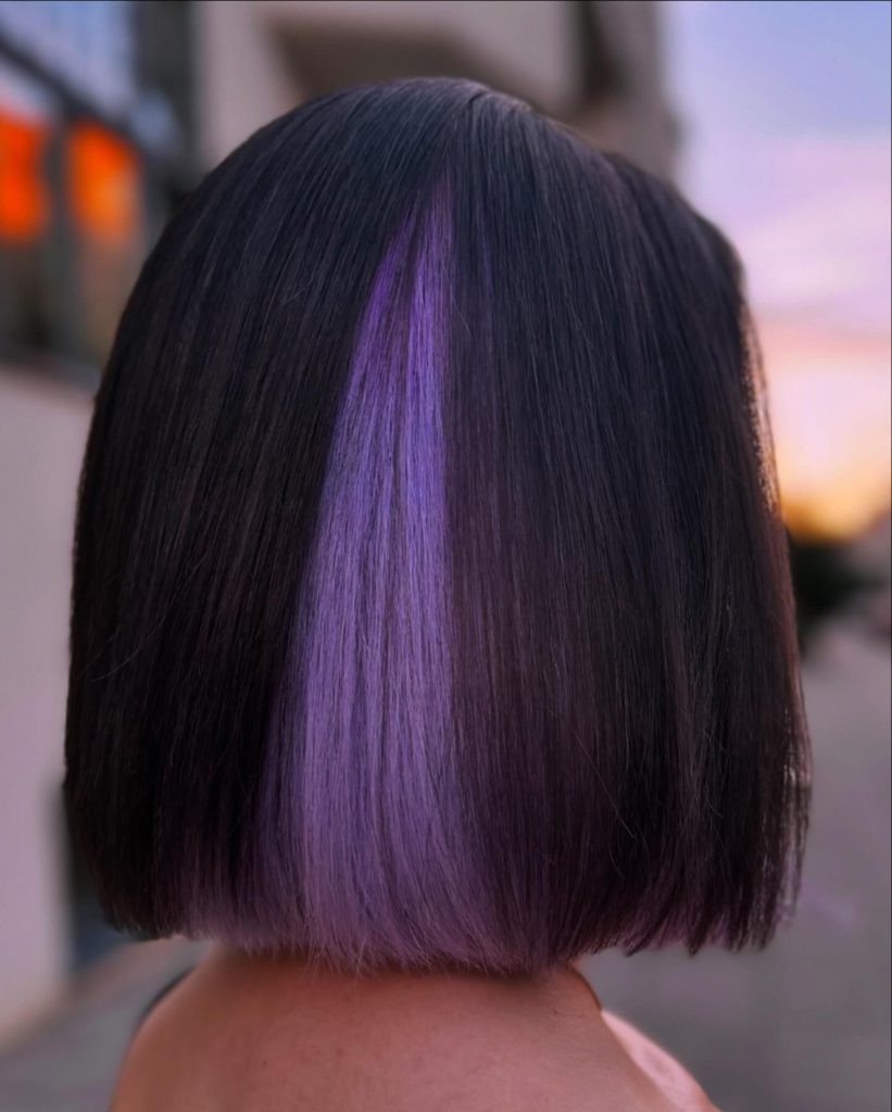 This sleek midnight black bob with a subtle purple streak is an elegant and refined choice for 2025. The purple accent adds a touch of color without overpowering the natural dark shade, making it a perfect style for brunettes looking for something different. This unique look suits those who want a professional style with a touch of creativity. The sleek cut enhances the purple accent, giving it a polished, modern feel that’s ideal for both formal and casual settings.