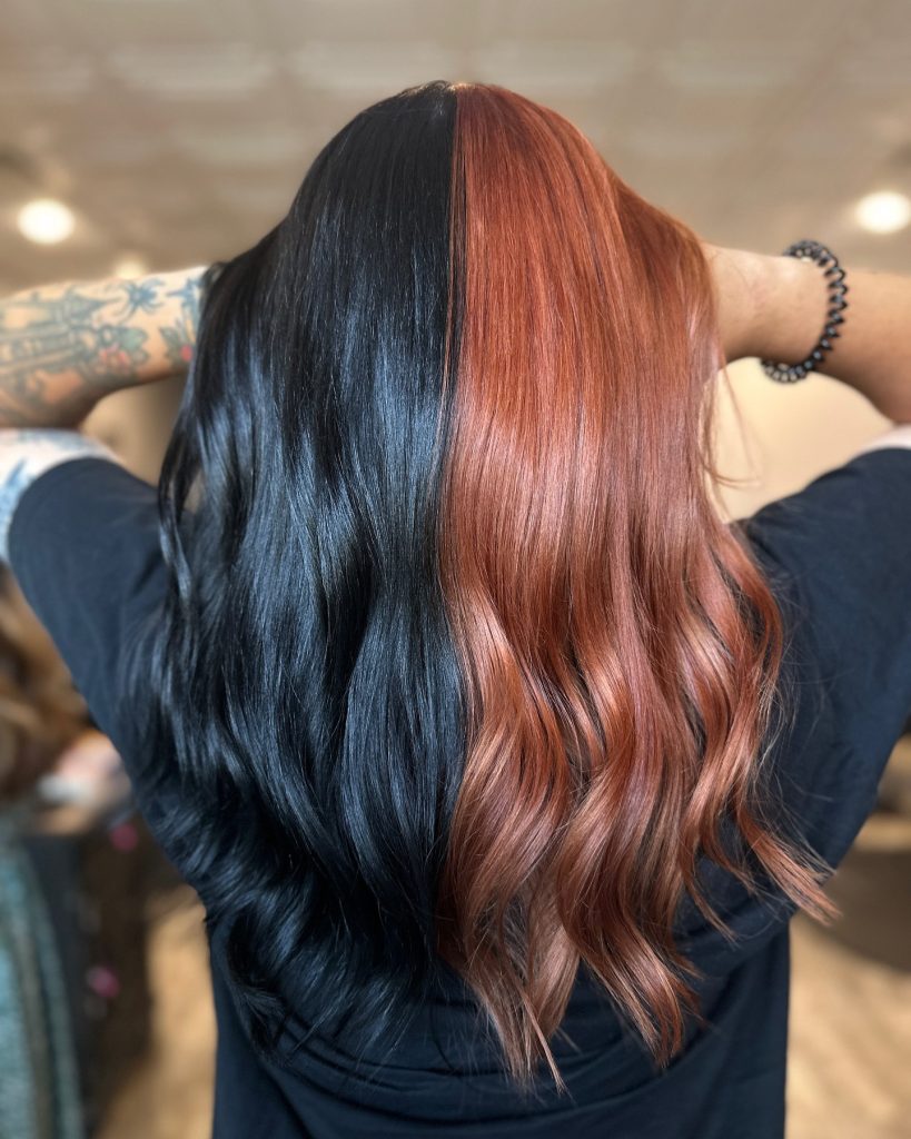 This bold half-and-half style features one side in a deep, inky black and the other in a warm, rich copper. The color contrast is both daring and elegant, creating a look that’s perfect for those who enjoy unique and cool styles. The soft waves add movement, enhancing the color division and giving the hair a glamorous, yet edgy vibe. This style is great for brunettes looking for a twist on traditional dark hues, providing a balance between dark sophistication and warm vibrancy.