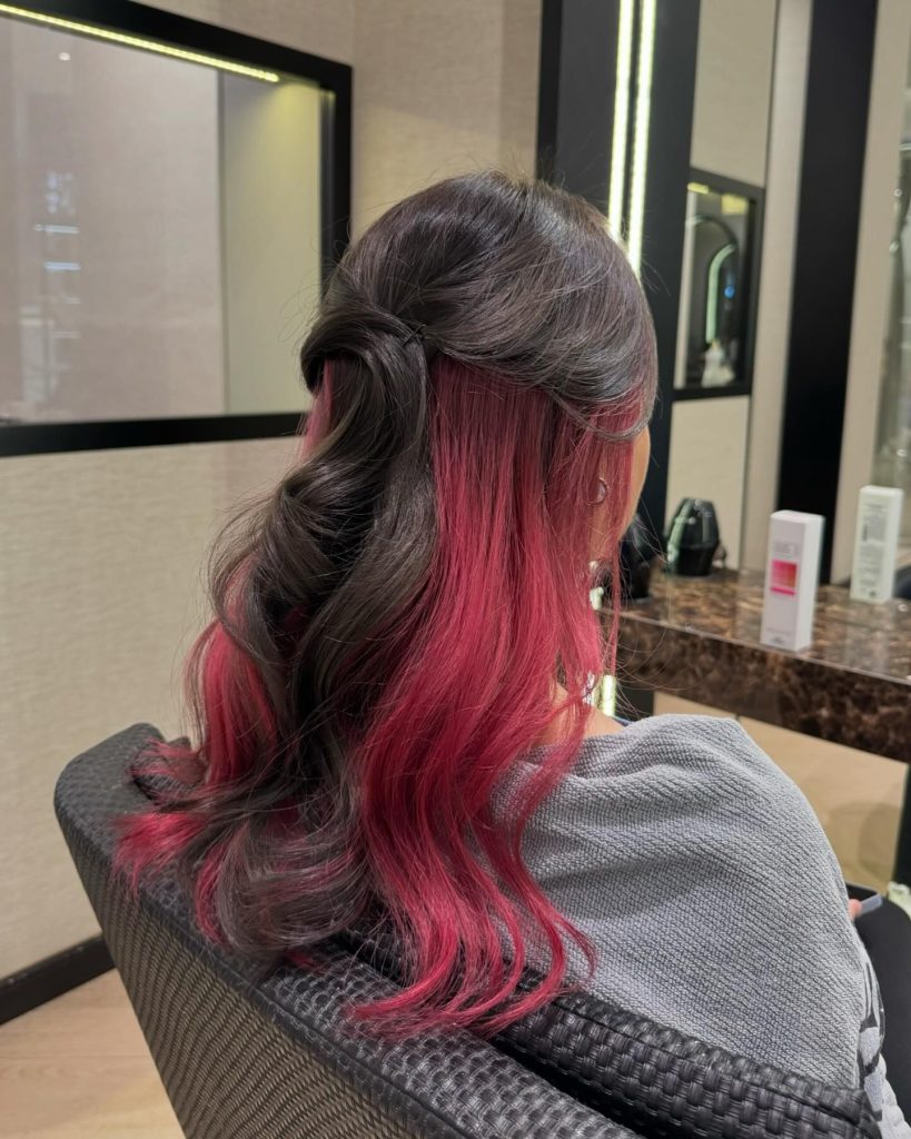 This style combines natural black hair with bold neon pink streaks, creating a vibrant contrast that’s perfect for brunettes who want a pop of color without a full dye. The bright pink accents add depth and aesthetic appeal, particularly when styled in loose waves. This look is ideal for those who prefer a low-maintenance style with a fun twist. It’s an excellent way to incorporate color while maintaining a polished, professional look.
