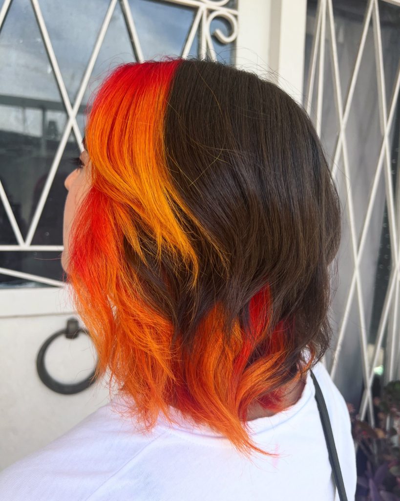 This striking half-black, half-orange split dye captures attention with its high-contrast color scheme. The rich orange hue adds warmth, while the black side keeps it grounded and grunge. This style is perfect for those looking to make a bold statement and is ideal for short hair or medium-length cuts. The vibrant orange brings a fiery energy, while the black adds a touch of mystery, making this look perfect for anyone who loves adventurous and unique color combinations.