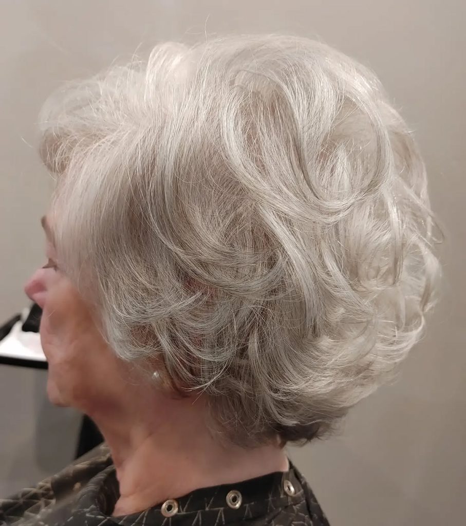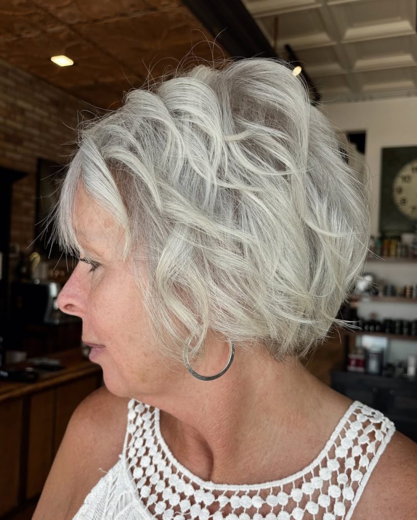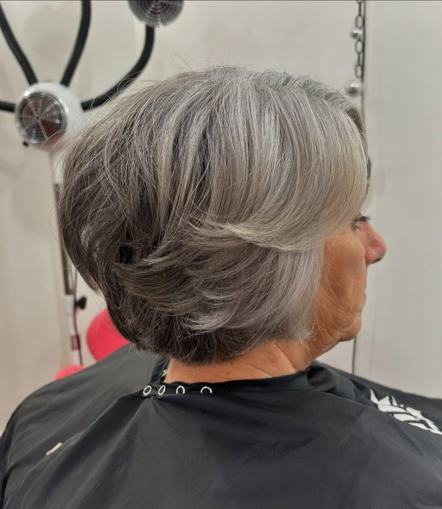 This breathtaking short layered style radiates confidence and class, perfect for women over 50 grey who want to embrace their natural beauty. The soft layers add movement, making the hair appear fuller—a great choice for those with thin hair. Styled with a gentle lift at the roots, this voluminous cut is perfect for formal occasions or everyday elegance. Pairing this style with pearl earrings or delicate accessories enhances its timeless charm.