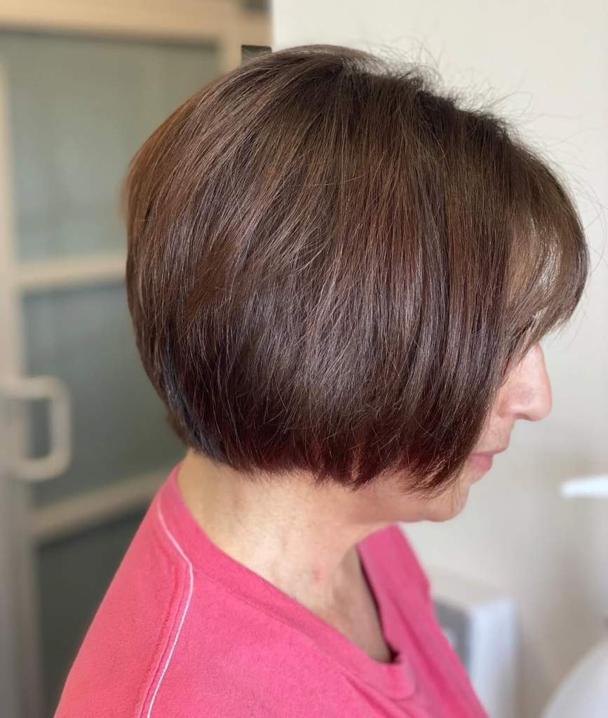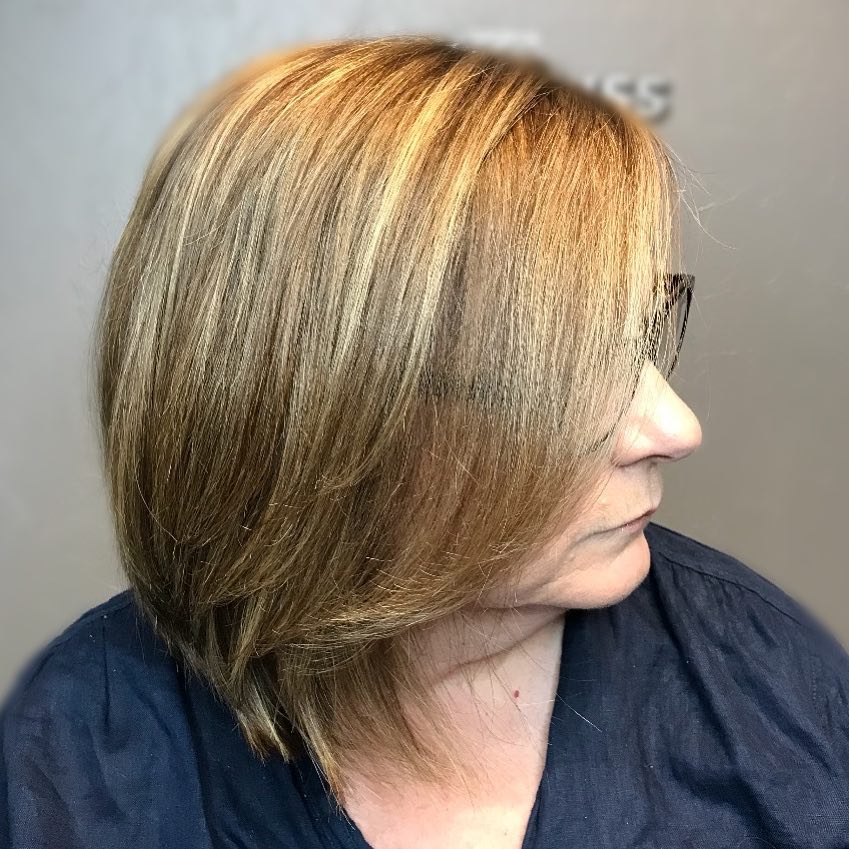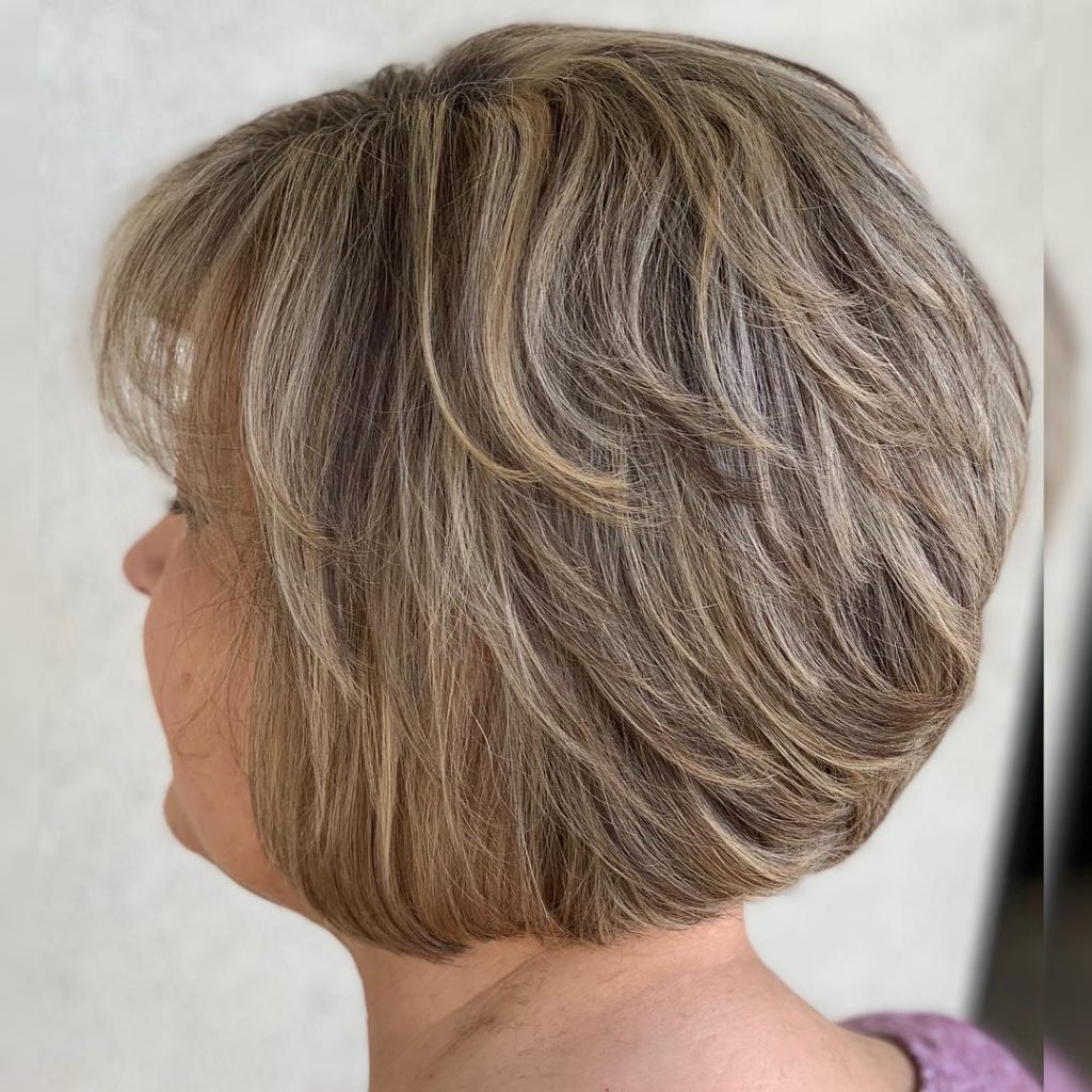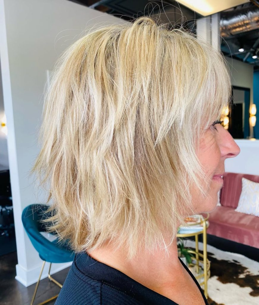 This layered layered bob with feathered ends is very easy for 50 plus women to look polished yet youthful. The soft blonde shades make the skin look brighter, while the structured layers have a classic yet relaxed look.