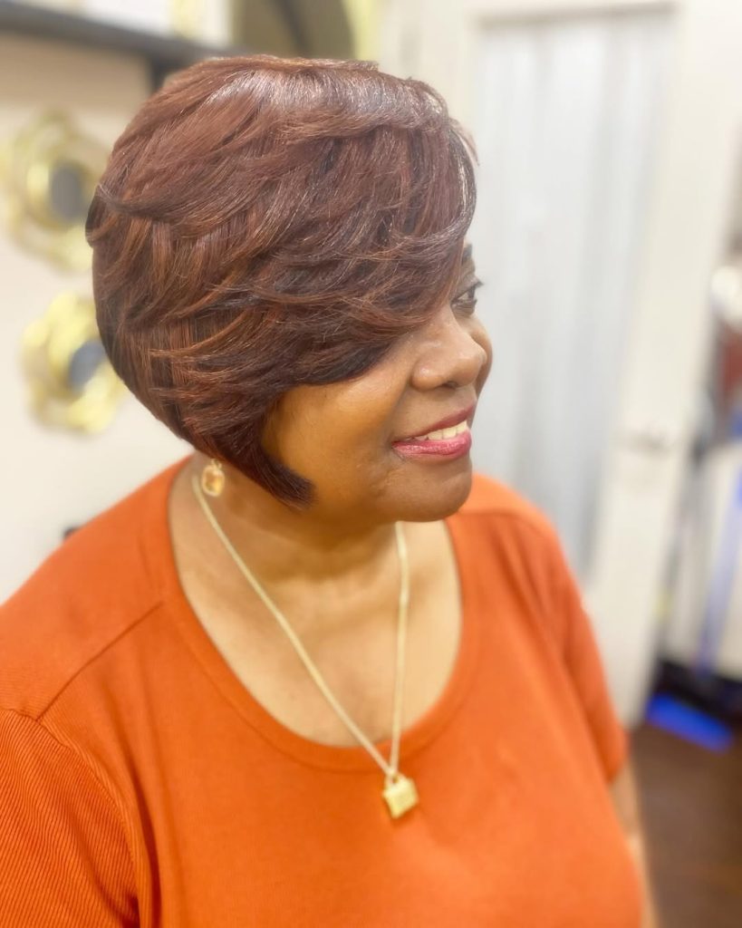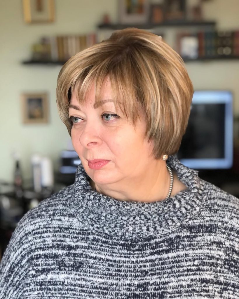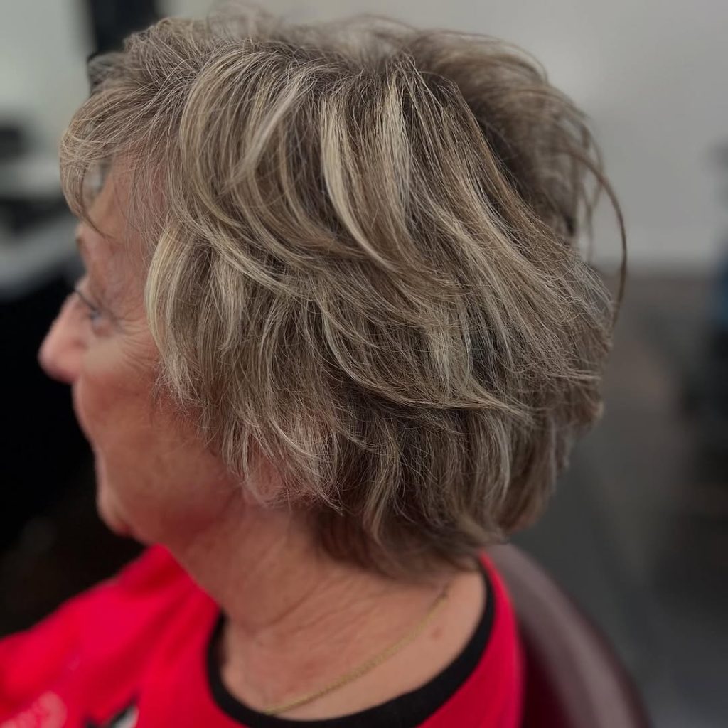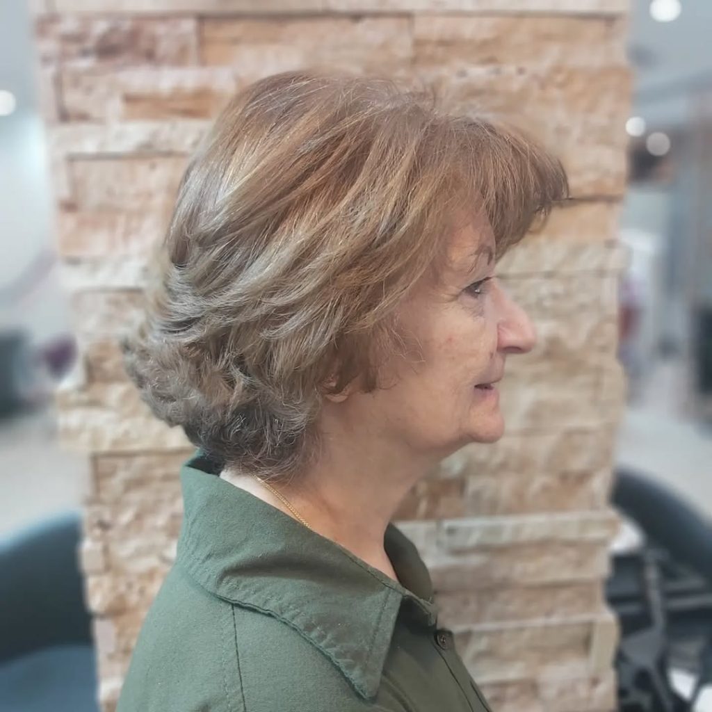 The short bob haircut, which has both volume and movement, is characterized by the soft curls and the feathered ends that give it a lively finish. The warm caramel tones are the ones that add depth and dimension to this choice of color, so it is perfect for women over 50 who are looking for a classic yet youthful style.