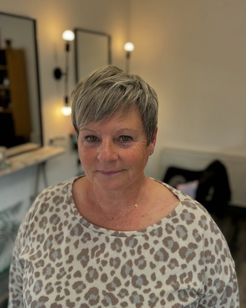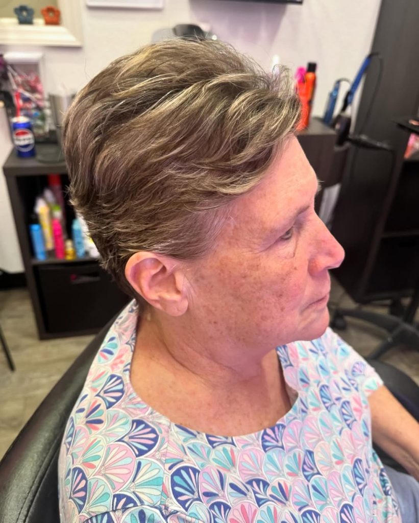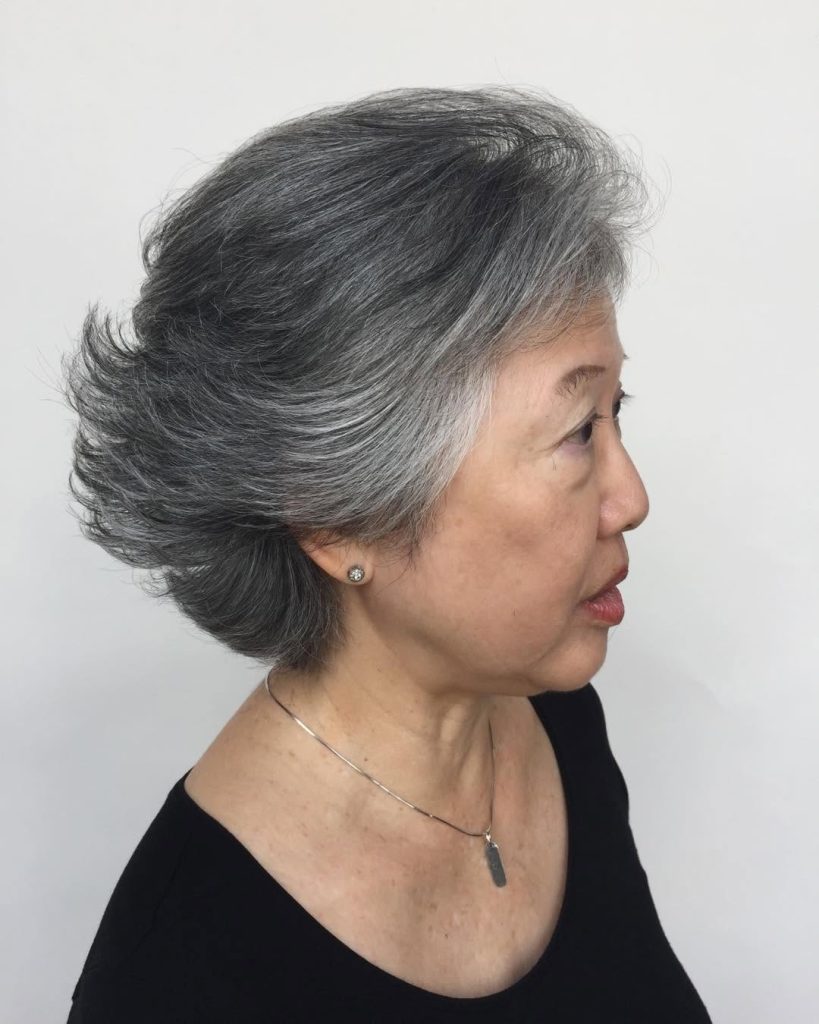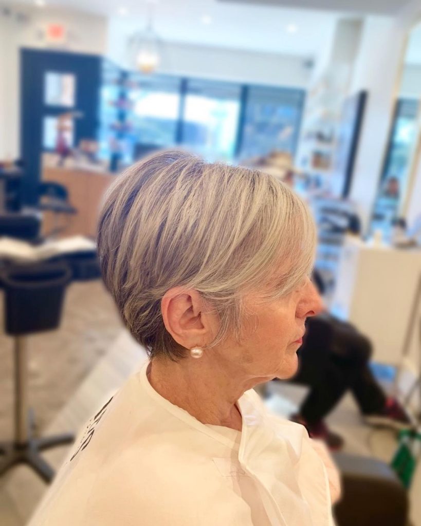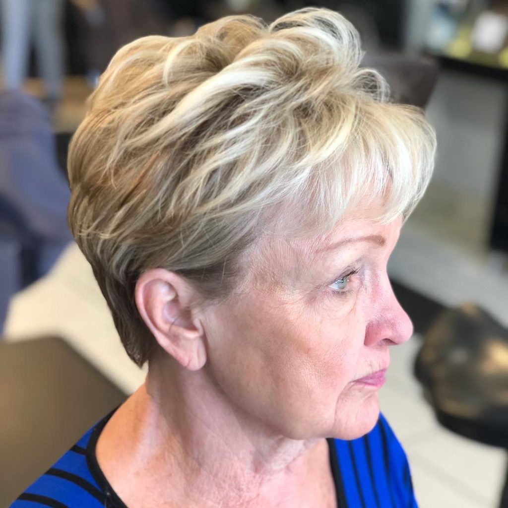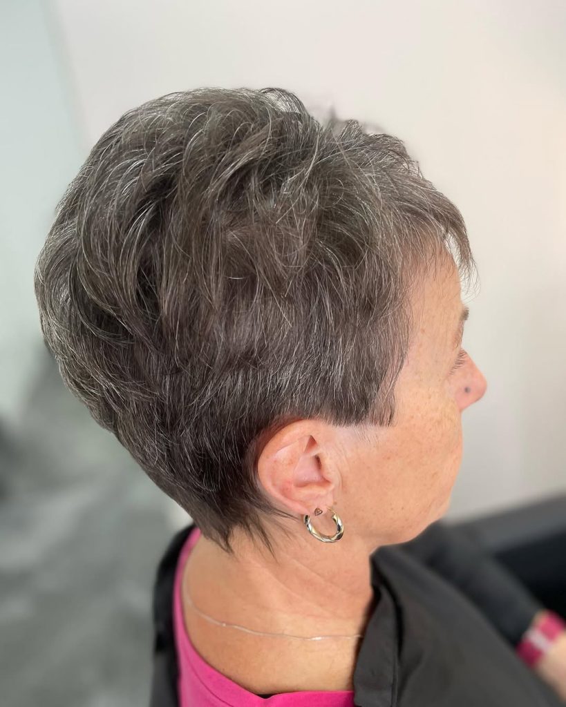 If you want to be different and elegant at the same time, this short shaved pixie haircut with layered textures is the choice. The silver colors and light volume make a fashionable yet classy episode. This type of pruned pixie cut is the everyday hairstyle for women above 50 who like an easy and breezy way to their hair.