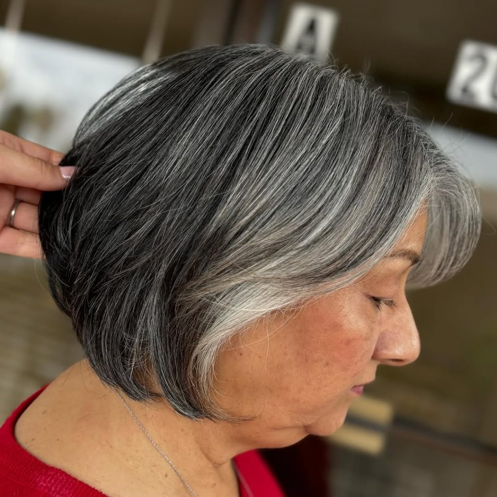 This elegant short hair bob with a soft side part spells a new story for silver strands quite beautifully, thus affecting a refined and polished look. The natural combination of the two shades, grey, and black hair not only gives depth to the hair but also makes it ideal for women over 50 grey who would like to emphasize their real beauty. The shiny surface of the material is both contemporary and adaptable; it is apt for both business meetings and for social get-togethers.