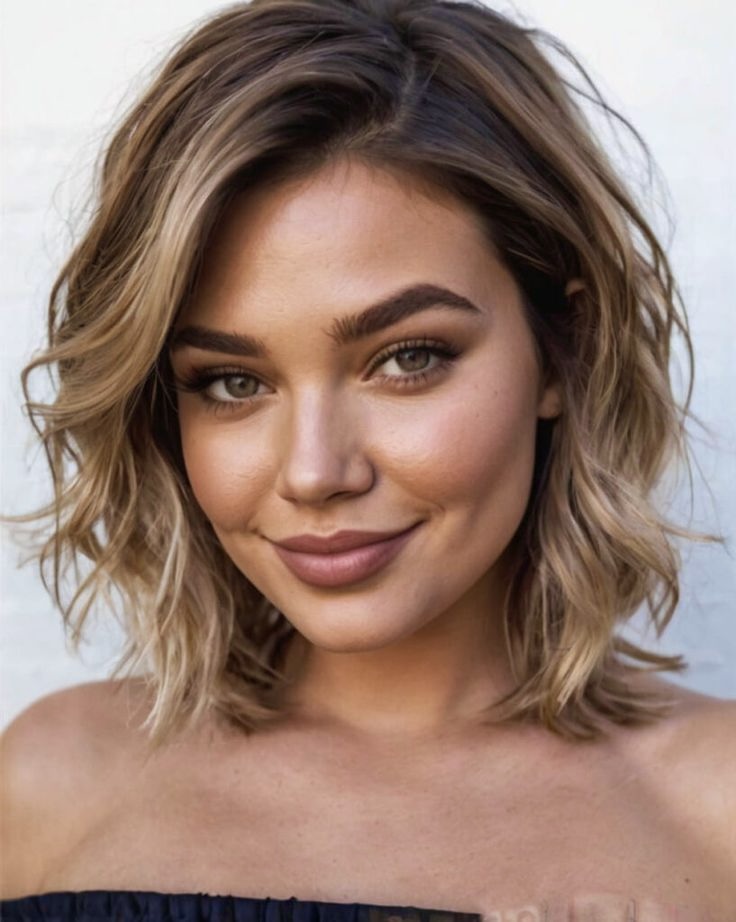 Romantic advantage of this medium-length cut is soft, tousled waves. The combination of warm highlights and deeper coloring has provided a lot of complexion but the size on top of the crown has stretched the face. It is casual but quality- it is the combination that is ideal to achieve a modern and careless style.