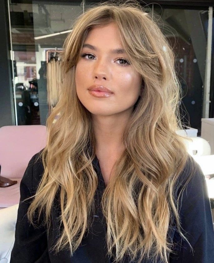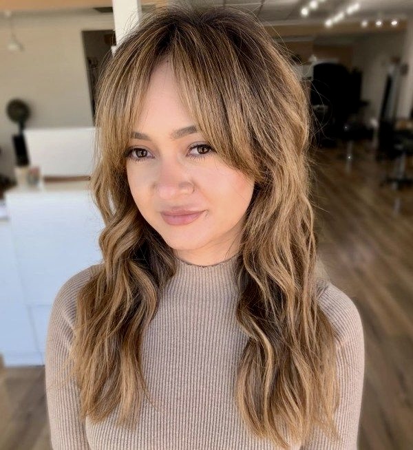 Long waves and delicate curtain bangs are a romantic casual style. The center split fringe helps the face looking thinner subtly and warm sun skim highlights add some brightness.