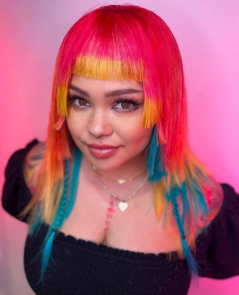This design is right off the neon-lit streets of Tokyo shiny pigtails with sleek edges and short bangs with fluffy cute accessories. It’s sweet, nostalgic, and unmistakably kawaii. The references to the Japanese street fashion are in every detail (the color blocking, the oversized clips).