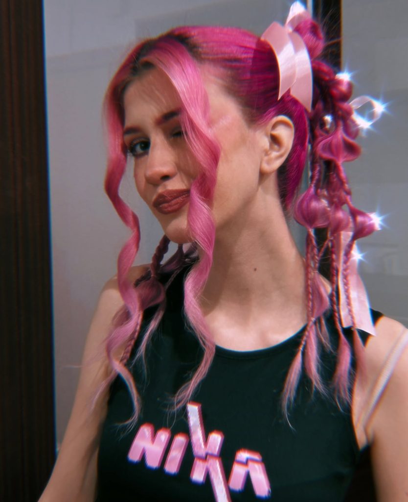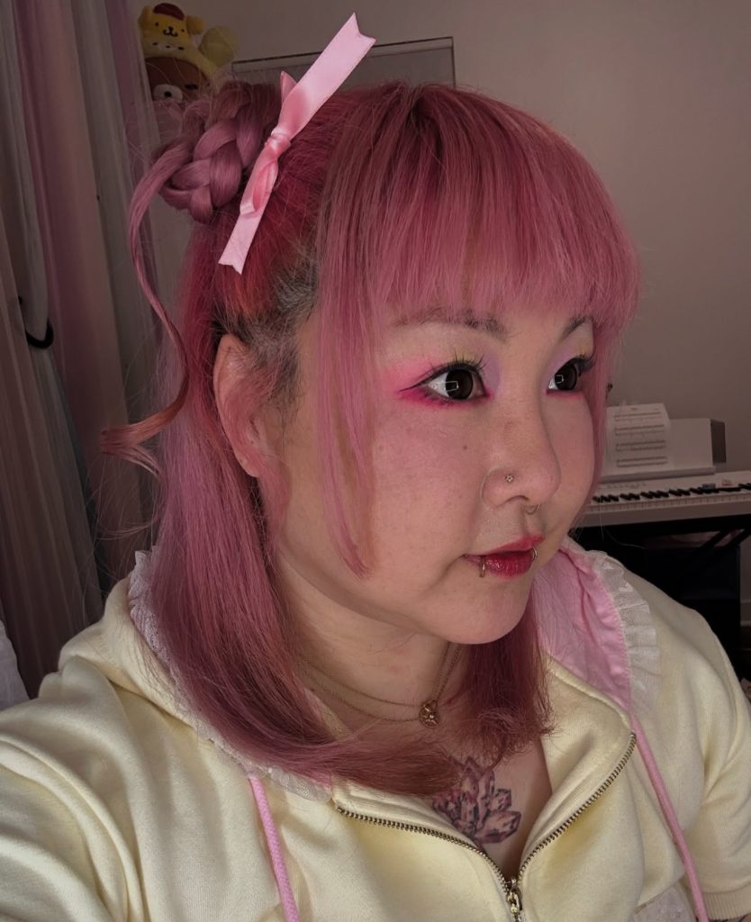 This fashion can be regarded as a love letter to soft girl aesthetics a perfect combination of sweet, attitude, nostalgia. The side bun, braided, is just accessorized with a pastel pink ribbon and seems a nod to the childhood dressing up, but all grown up: confident make-up and delicate glam.