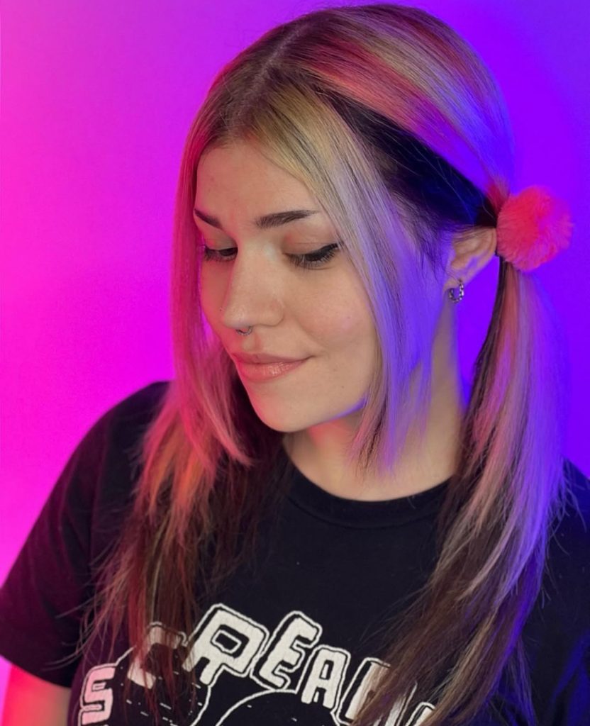 This hairstyle has both a soft grunge look and kawaii effect. The cartoonish character with two-tone coloring and fluffy pigtails exudes the cool-girl vibe yet it is still playful. Face-framing strands mellow down the entire appearance and provide it with exactly the level of movement.