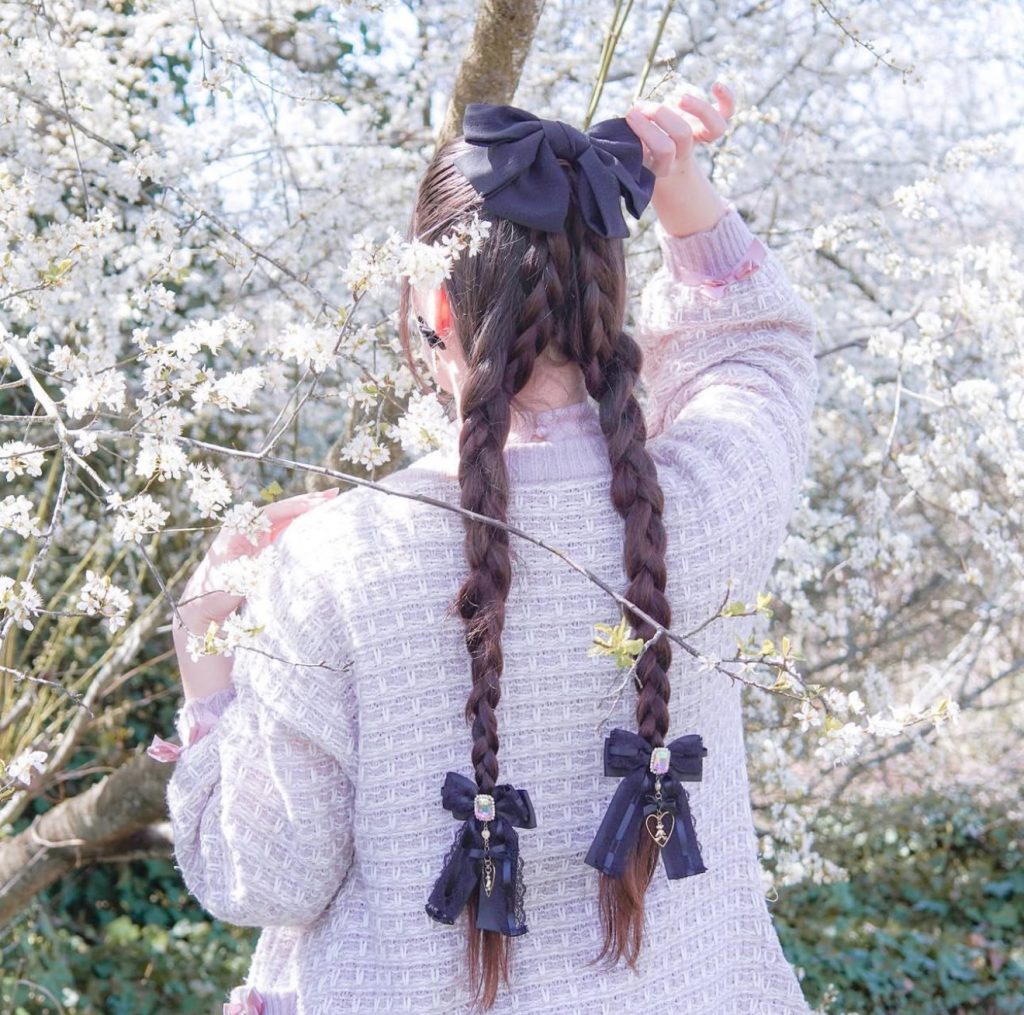 This appearance has a gentleness to it that is like a fairytale blossoming. The twin braids with the tiniest of charms on them and lace bows are beyond cottagecore -meets-Yume energy. This hairstyle literally beckons you to stroll along blossoms of cherry and hold a cup of tea in your hands.
