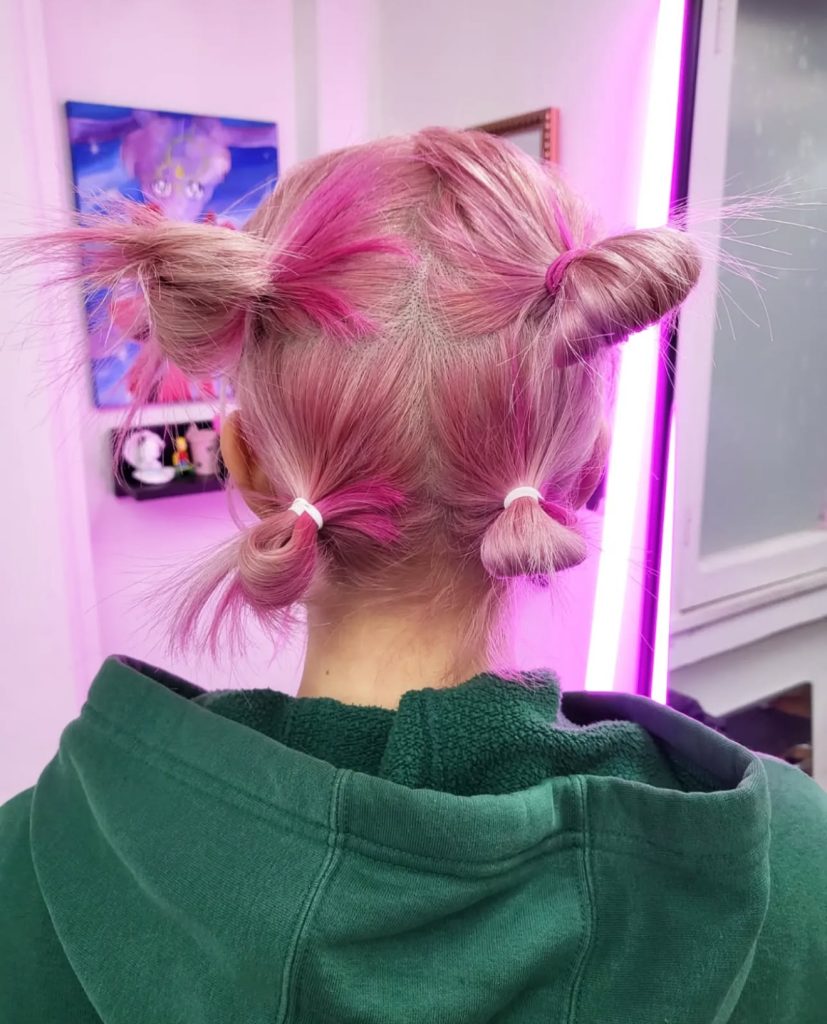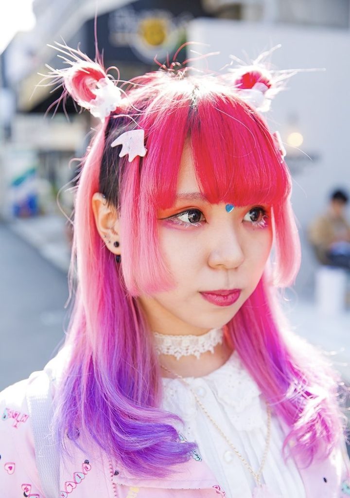 This appearance is high energy, high glam and the right amount of messy around. The pigtails (in the shape of horns) at the top look serious anime heroine-esque, but the pink to purple ombr root yells personality. Put on white barrettes and a touch of glitz and it is magic in action.