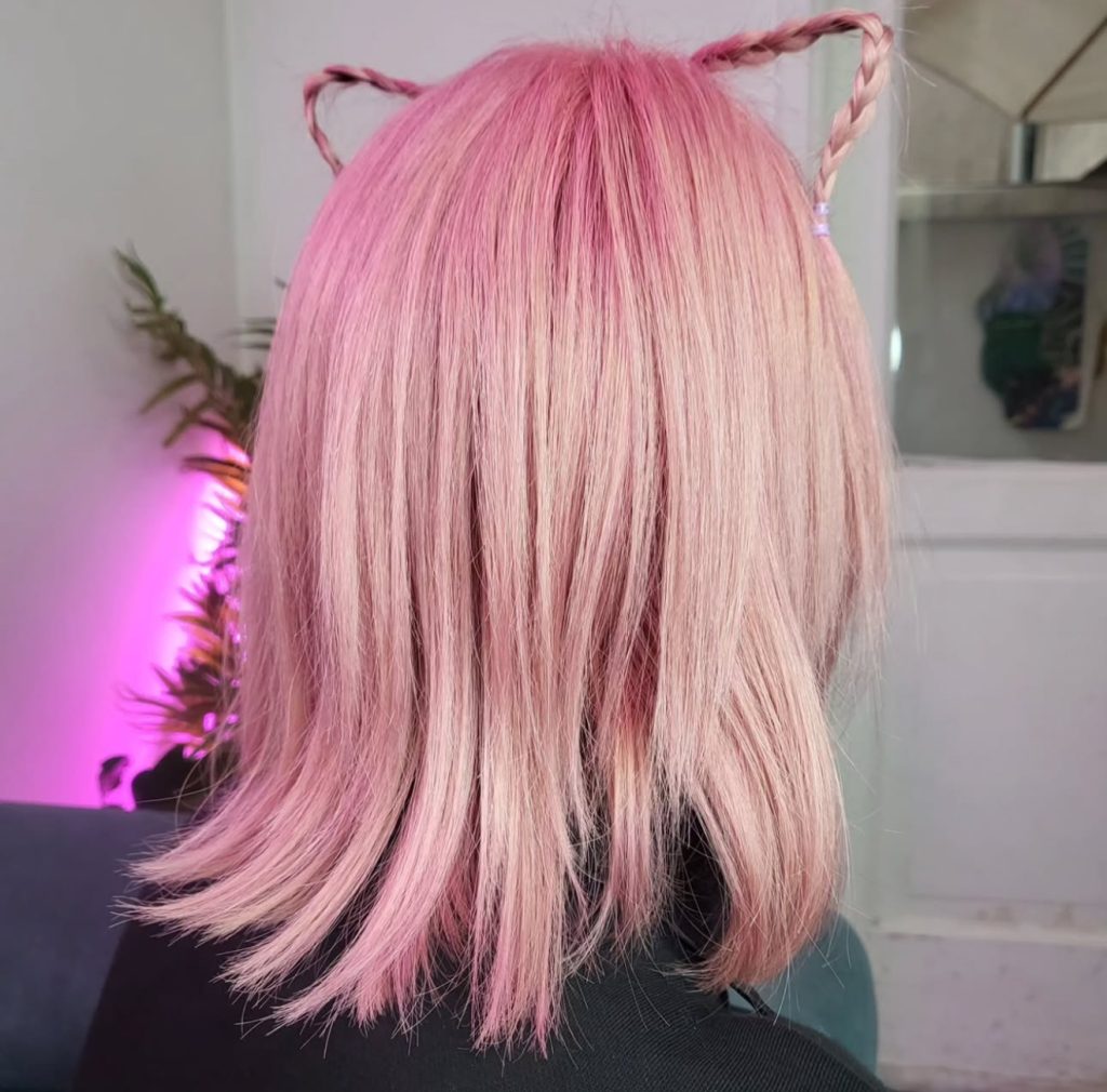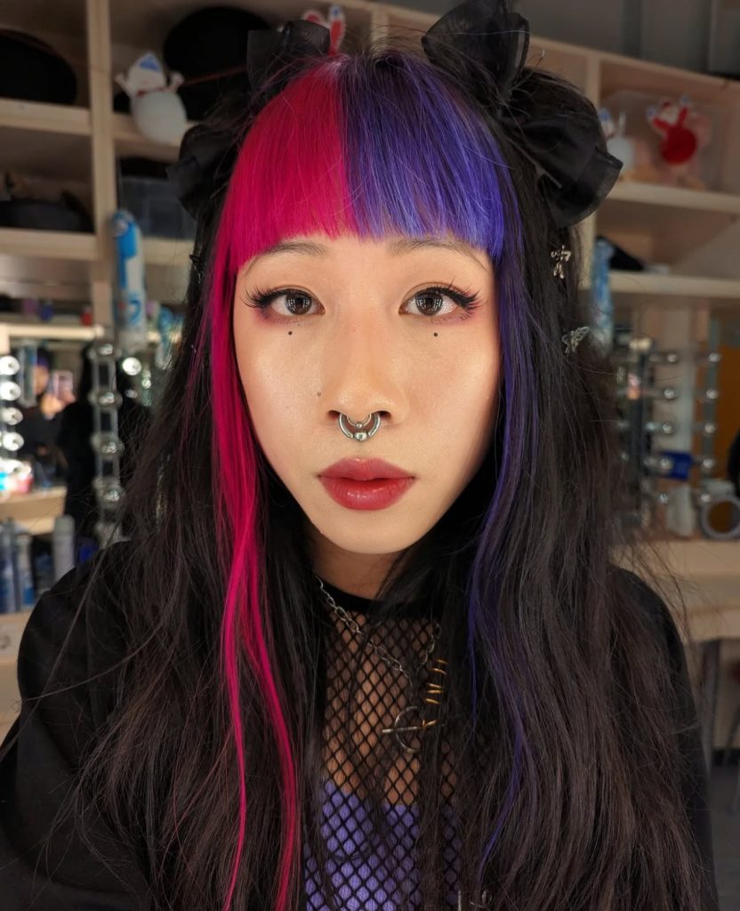 This hairstyle is all heart-eyes and cheeky charm. The vibrant fuchsia pigtails and face detailing long bangs make a positive and flirtatious impression and evokes the vibe of Japanese pop-princesses. It is the hair on which you impulse to pose, wink and twirl through the day.