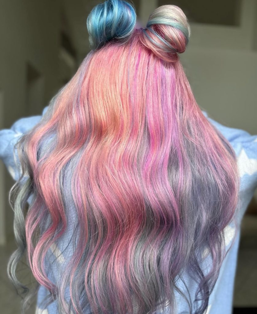 This look is pure cotton candy dreams. Soft locks in muted colors of pinks, purple and sky blue tumble down like a friendly galactic holiday and two perfectly situated buns topped it off with some good old intergalactic style. It is that sort of the hair that makes a girl feel like a moon princess in a Studio Ghibli crossover.