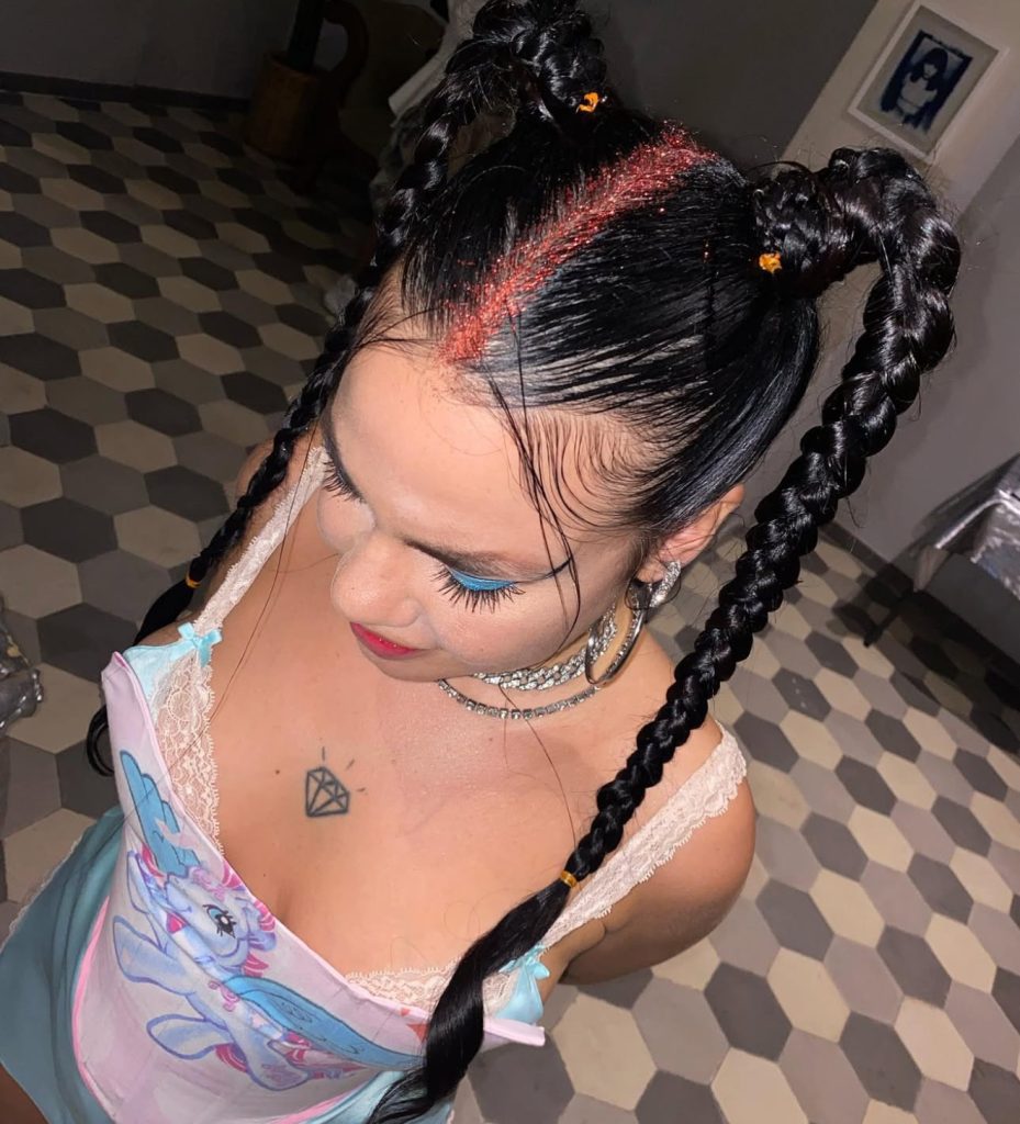 It’s giving sparkle, power, and all-night energy. The fearless glamour of a J-pop idol in the middle of tour runs through these ultra-slick braided pigtails, parted down the centre, through copiously applied glitter. This excellent texture and shine makes it hyper-athletic and hyper-cosplay at the same time and as high-maintenance (as in your choice) as you want.