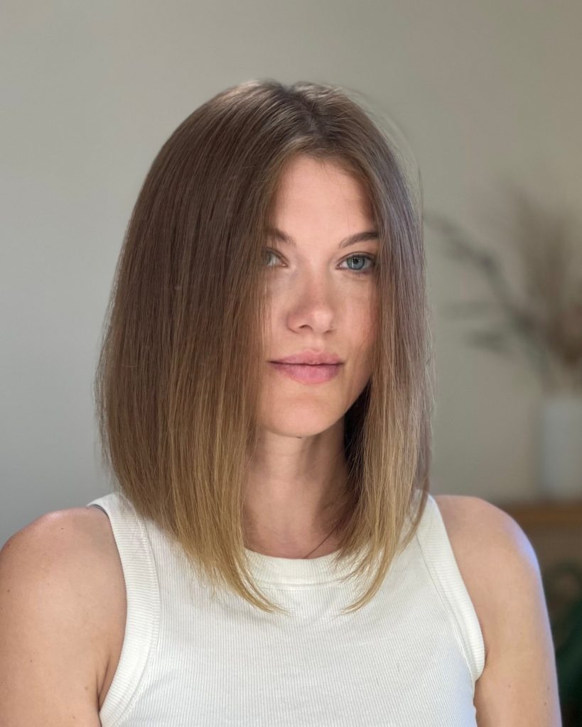 This lob with a straight and blunt cut is a clear sign of high class and self-awareness. It is suitable for straight-haired people who just want a simple, mathematic style. The blunt cut at the ends makes it heavier, which is why this lob is a perfect choice for thick hair that has a natural shine. To achieve this look, you don’t need to do much styling – just blow-dry it with a paddle brush to get a smooth finish or you can use a flat iron to get a perfect straight hair. It is a chic and low-maintenance hairstyle that fits every lifestyle, whether it is a busy professional or a trendsetter who loves minimalist aesthetics.