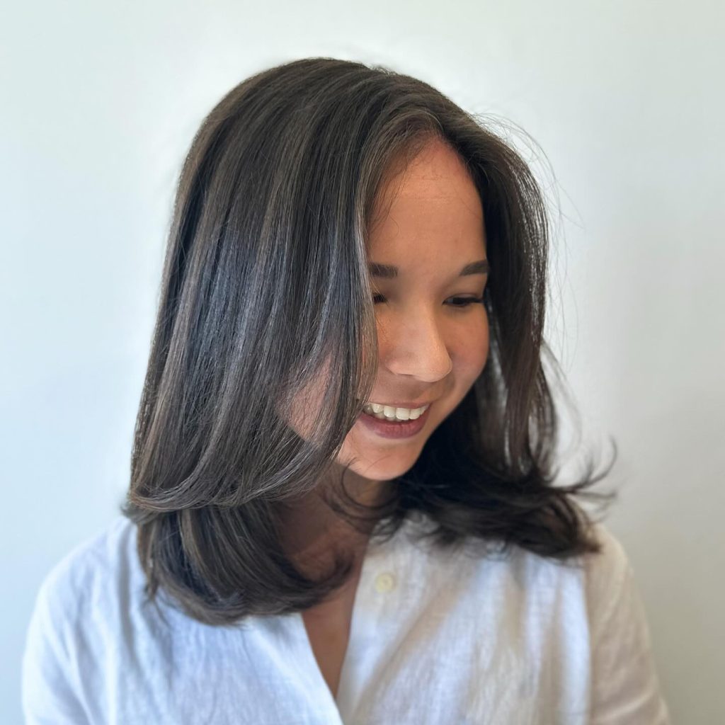 This ultra-stylish, shiny lob with side hair swept curtain bangs is a contemporary classic, presenting both simplicity and sophistication. The curtain bangs form a gentle, face-framing effect, so this style is particularly suitable for women with fine to medium hair who are looking for a little more dimension. This hairstyle is a very good choice for a formal event and is appropriate for women who want to enrich their style with a slight 90s influence. Bang a flat iron on the hair to make it look super smooth and straight. You can also apply a bit of volumizing spray to the bangs for an extra lift.