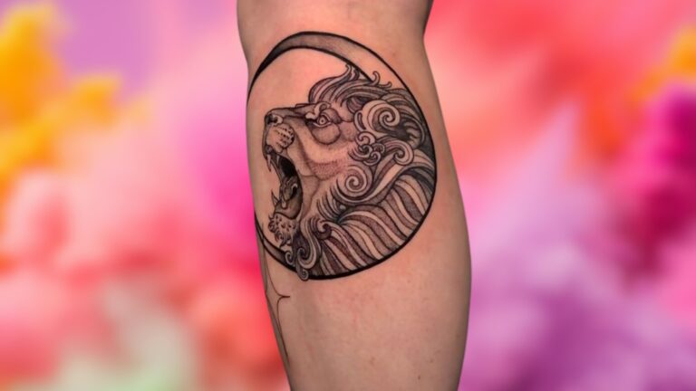 Leo, symbolized by the lion, represents courage, confidence, and leadership. This Leo tattoo is a bold choice to ink on your leg, showing a roaring lion and a crescent moon.